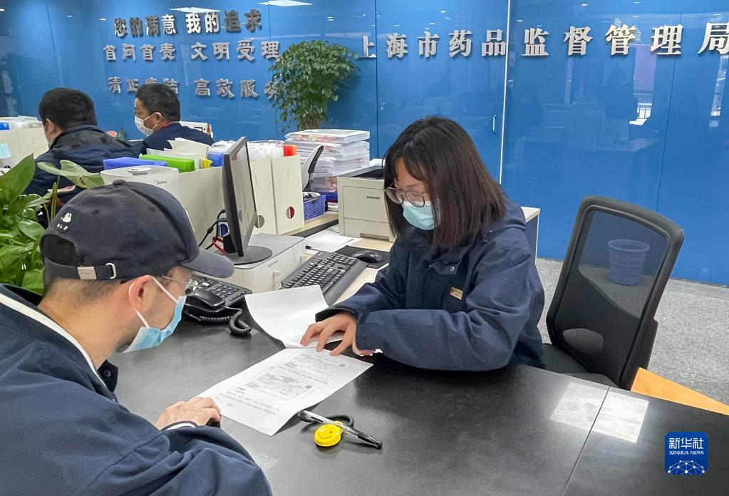 3月10日,上海市藥品監督管理局工作人員為企業(yè)辦理業(yè)務(wù)。 新華社記者 程思琪 攝