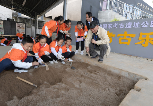 圖為2019年,在位于桂林的甑皮巖國家考古遺址公園,考古專(zhuān)家(右一)指導孩子們模擬發(fā)掘。新華社記者李賀 攝