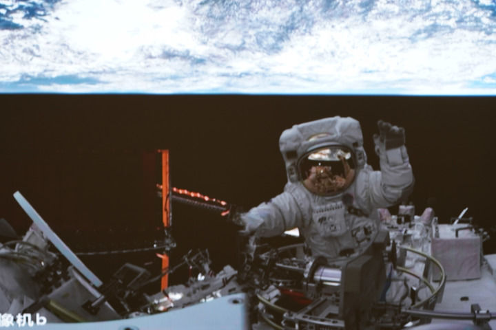 2023年4月15日在北京航天飛行控制中心拍攝的神舟十五號航天員張陸結束出艙任務(wù)返回問(wèn)天實(shí)驗艙時(shí)揮手致意的畫(huà)面。新華社記者 郭中正 攝