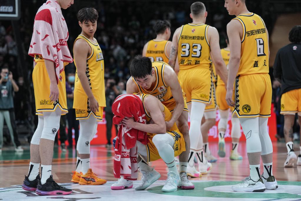 5月5日,廣廈隊球員朱俊龍安慰隊友孫銘徽(下)。新華社記者潘昱龍攝