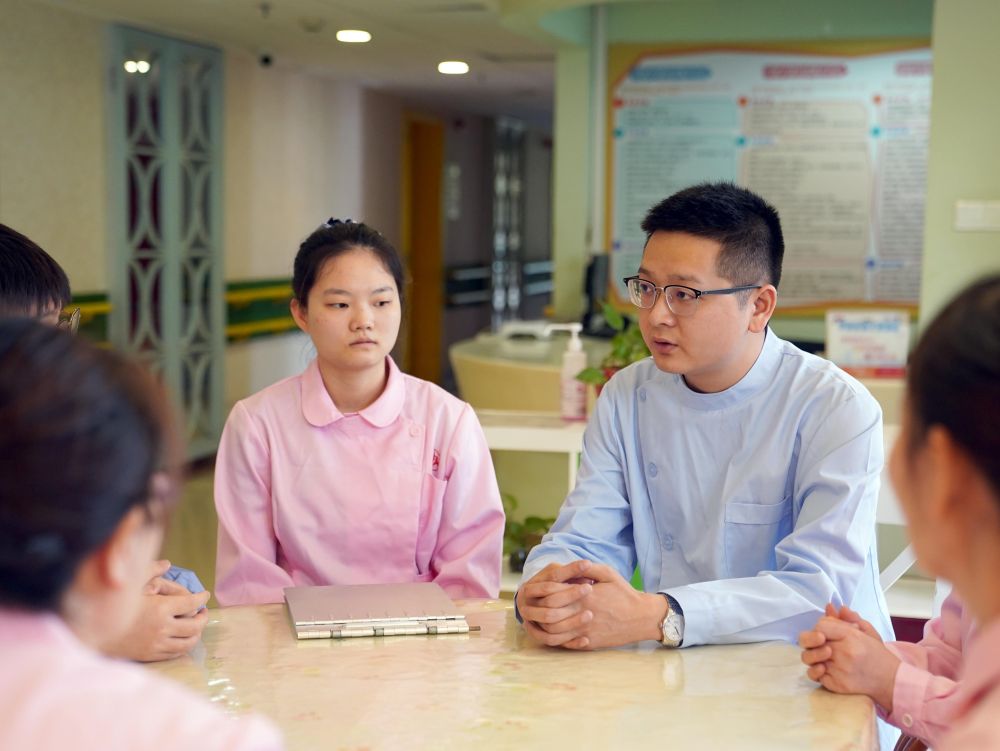 在上海市楊浦區社會(huì )福利院,護理主管王程(右)在護理員例會(huì )上點(diǎn)評發(fā)言(4月28日攝)。新華社記者 劉穎 攝