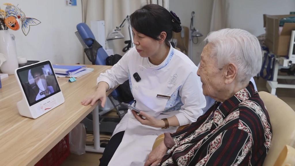 在福州臺江區上海街道社區居家養老照料中心,92歲的老人張霞在醫護人員幫助下,通過(guò)“健康小管家”系統與醫生進(jìn)行交流,這項服務(wù)是福建省級機關(guān)醫院開(kāi)展的家庭病床服務(wù)。針對行動(dòng)不便的老人,主治醫師通過(guò)上門(mén)或者視頻連線(xiàn)的方式,每周例行檢查。
