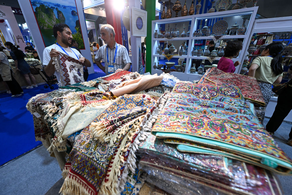 6月8日,來(lái)自伊朗的參展商在第十九屆文博會(huì )伊朗展臺整理地毯。新華社記者 毛思倩 攝