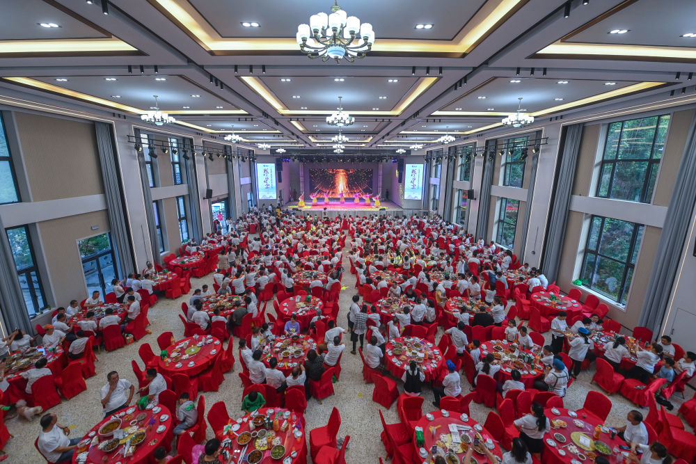 浙江建德市新安江街道梅坪村村民在村文化禮堂內參加百家宴并觀(guān)看文藝演出(2023年5月27日攝)。新華社記者 徐昱 攝