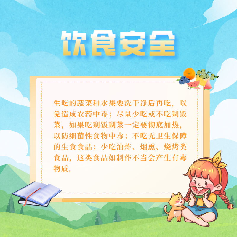 6.飲食安全:生吃的蔬菜和水果要洗干凈后再吃,以免造成農藥中毒;盡量少吃或不吃剩飯菜,如果吃剩飯剩菜一定要徹底加熱,以防細菌性食物中毒;不吃無(wú)衛生保障的生食食品;少吃油炸、煙熏、燒烤類(lèi)食品,這類(lèi)食品如制作不當會(huì )產(chǎn)生有毒物質(zhì)。