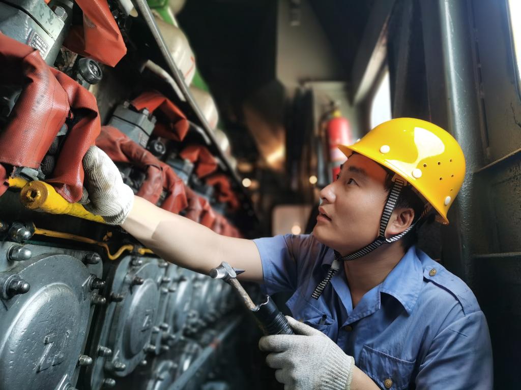 清潔吹掃散熱系統,查看管路漏油情況,檢查柴油機、電氣設備等運行是否正?!瓌倓倷z修完上一臺機車(chē)的他身上沾著(zhù)油污、臉頰熱得通紅,顧不上休息就投入了新一輪“體檢”工作中。