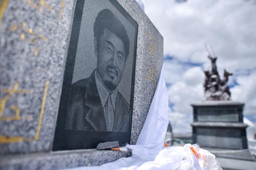 這座石碑鐫刻著(zhù)杰?!に髂线_杰的名字。20多年前,為了保護瀕危的藏羚羊,他與盜獵分子槍?xiě)鸬缴詈笠豢?,遺體被凍結成冰雕。