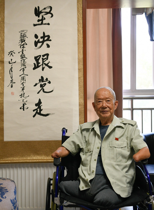 初夏的午后,記者來(lái)到四川省革命傷殘軍人休養院周全弟的家里,一進(jìn)門(mén)就被墻上的書(shū)法作品所吸引,上書(shū)“堅決跟黨走”五個(gè)大字,落款是“四肢截除壹級傷殘軍人周全弟抱筆書(shū)”。