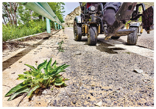 輪椅車(chē)操作起來(lái)并不容易。由于大部分身體無(wú)法動(dòng)彈,胡少杰只能半躺在車(chē)上,靠右腳掌控方向。家門(mén)口是“之”字形的陡坡,出村的路部分還是土路。一路上,電動(dòng)車(chē)有時(shí)滑得很快,近乎側倒;有時(shí)陷在坑里,開(kāi)不出來(lái)。不管是何處境,胡少杰都很耐心。