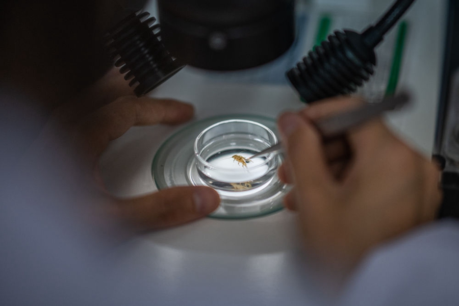在長(cháng)江流域生態(tài)環(huán)境監督管理局實(shí)驗室,監測人員對底棲動(dòng)物樣品進(jìn)行鑒定 肖藝九/攝