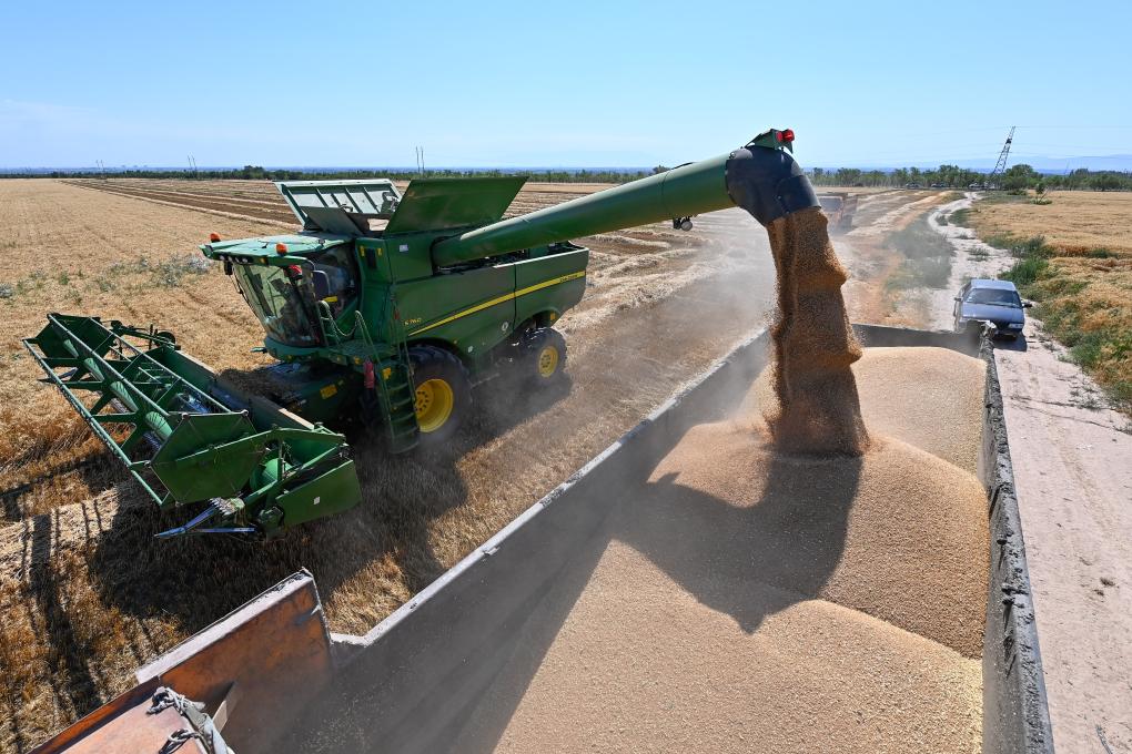 司張輝操作聯(lián)合收割機在新疆呼圖壁縣二十里店鎮寧州戶(hù)村將小麥裝車(chē)(7月15日攝)。新華社記者 丁磊 攝