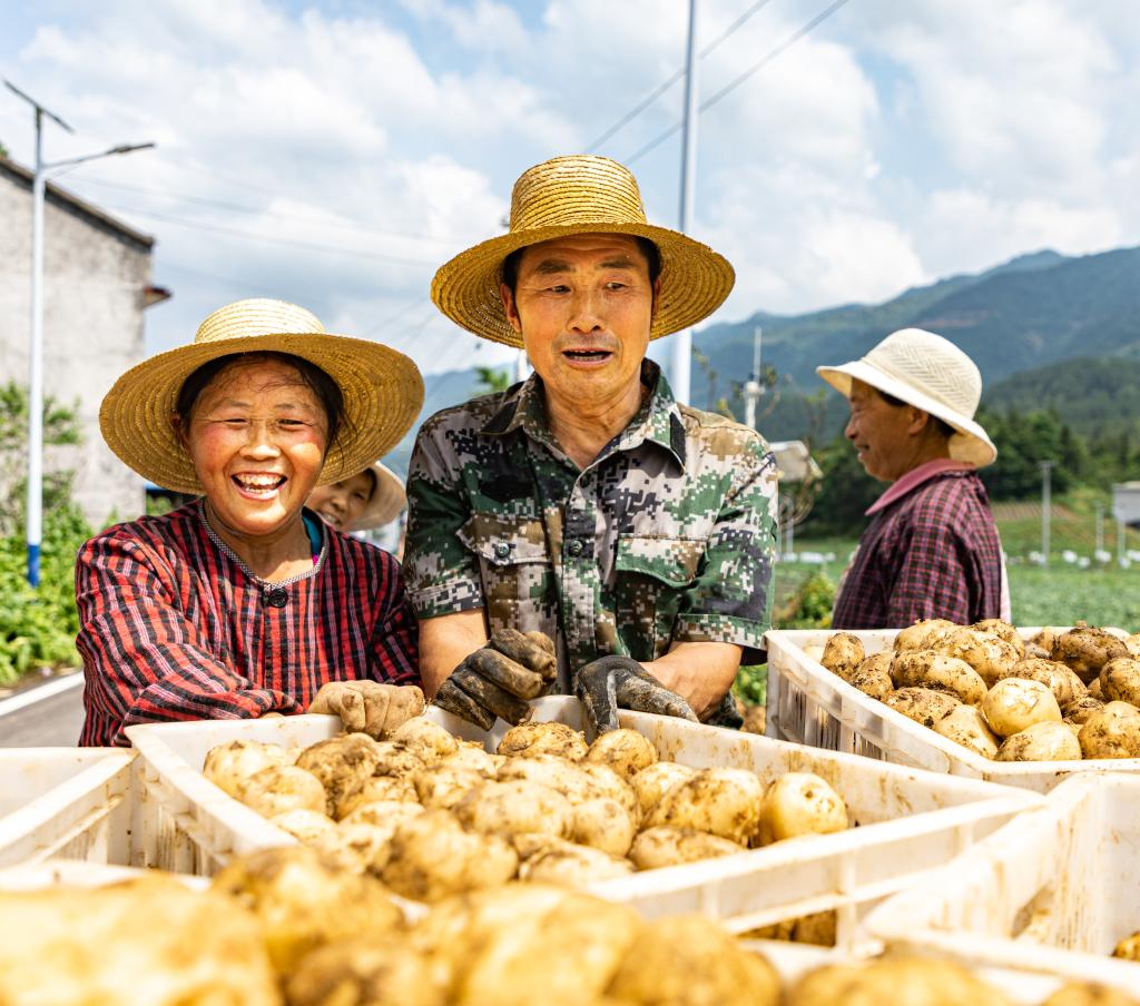 5月29日,在重慶市巫溪縣尖山鎮馬鈴薯綜合試驗示范基地,村民在展示剛挖出來(lái)的馬鈴薯。新華社發(fā)(冉夢(mèng)竹 攝)