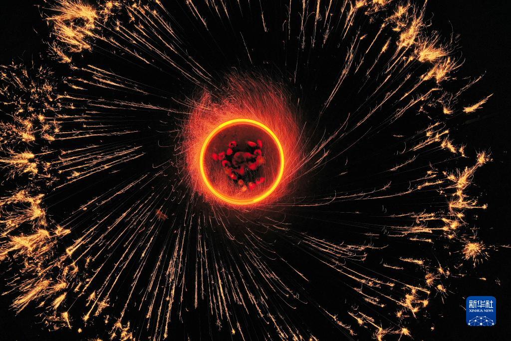 河北省灤平縣火斗山鎮大店子村的民間藝人在表演“掄花”(7月5日攝,無(wú)人機照片)。新華社記者 牟宇 攝