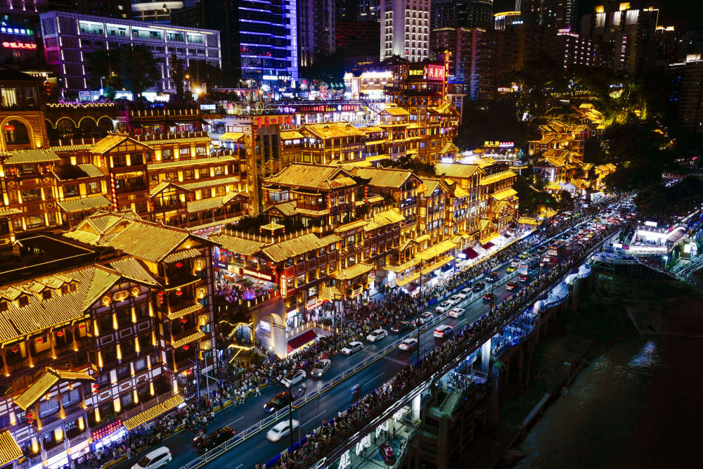 仲夏之夜,洪崖洞吊腳樓式建筑群臨江而立、攀巖直上,璀璨奪目的燈光,與熙熙攘攘的游客、鱗次櫛比的門(mén)店構成一幅熱氣騰騰的“山水不夜城”圖景。