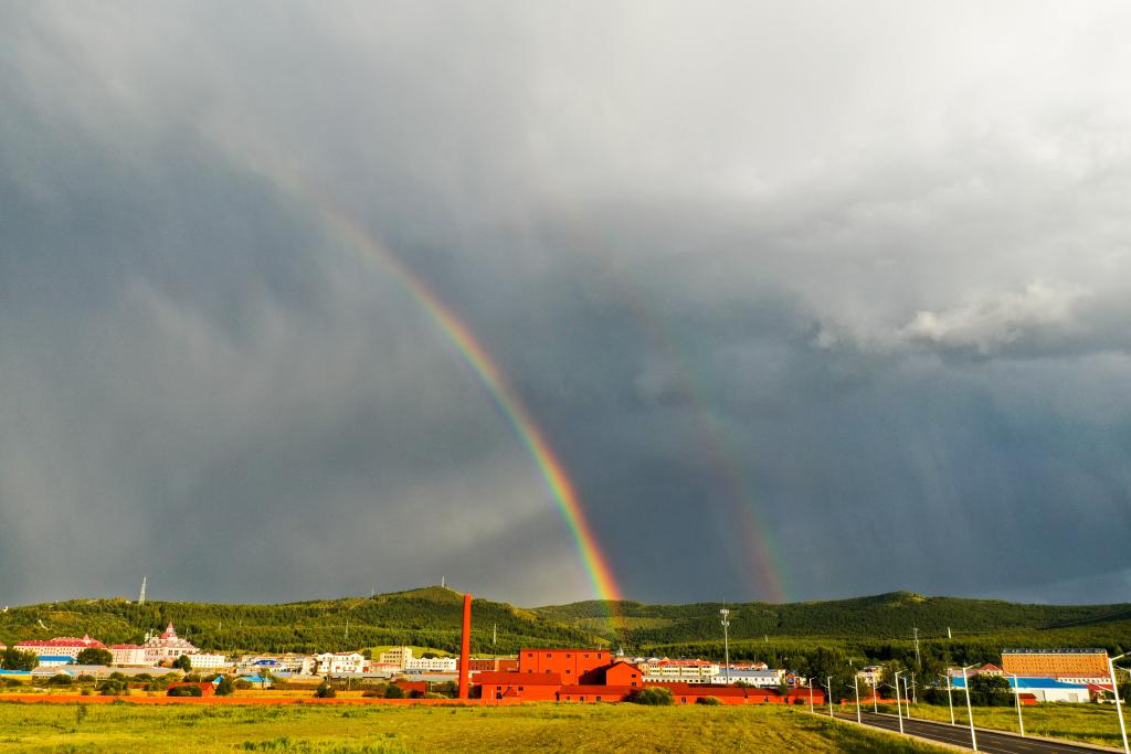 這是8月31日拍攝的阿爾山市的彩虹(無(wú)人機照片)。新華每日電訊記者 連振 攝