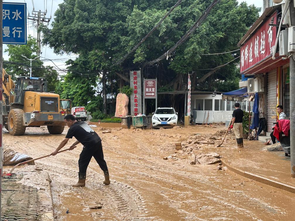 7日,躍進(jìn)村人力與鏟車(chē)協(xié)同作業(yè)清理道路淤泥。新華社記者 鄧倩倩 攝