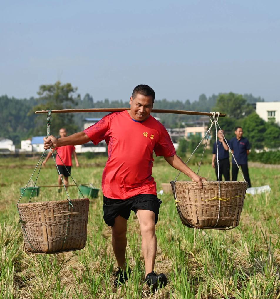 各參賽隊隊員肩挑一擔30公斤糧食進(jìn)行接力