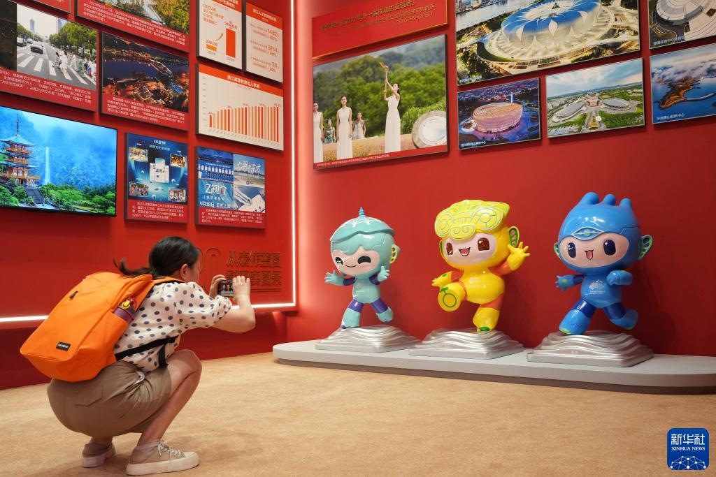 9月9日,大道之行——“八八戰略”實(shí)施20周年大型主題展覽在浙江省杭州市開(kāi)展,參觀(guān)者在展覽上拍攝杭州亞運會(huì )吉祥物。新華社記者 翁忻旸 攝