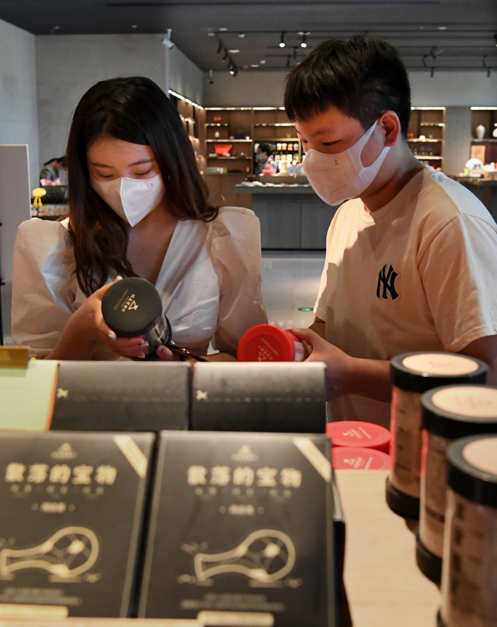 參觀(guān)者在河南博物院文創(chuàng )商店內挑選“考古盲盒”(2022年5月17日攝)。新華社記者 李安 攝