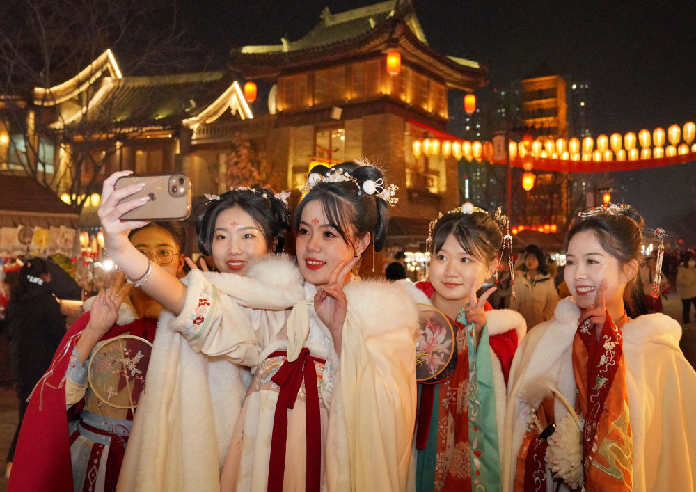 身穿漢服的游客在洛陽(yáng)洛邑古城內拍照(2023年2月22日攝)。新華社記者 李安 攝