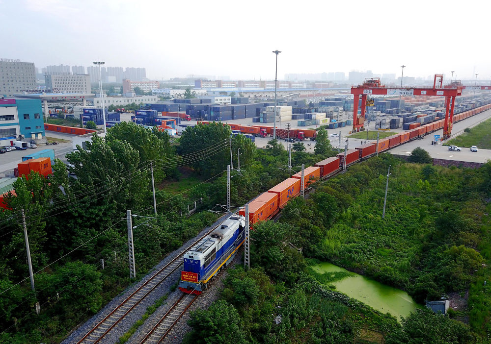 一列中歐班列(鄭州)駛出鄭州鐵路集裝箱中心站(2017年8月2日攝)。新華社記者 李安 攝