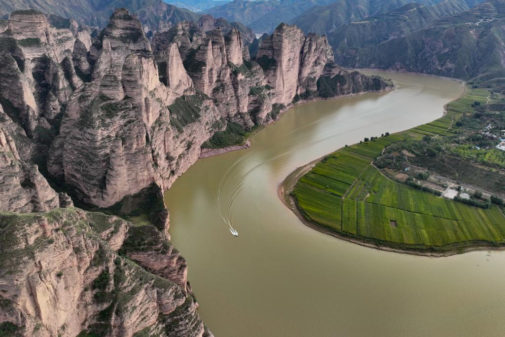 這是9月20日拍攝的炳靈寺石窟周?chē)S河及石林風(fēng)光(無(wú)人機照片)。新華社記者 郎兵兵 攝