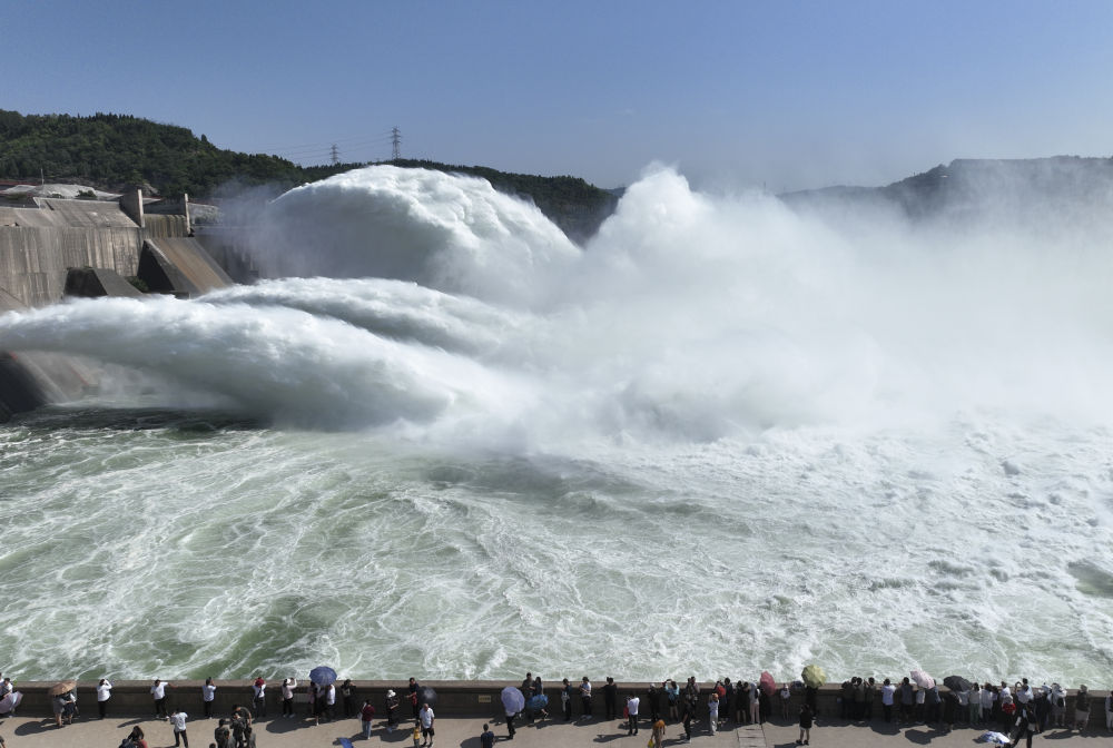 游客在黃河小浪底水利樞紐工程出水口觀(guān)看調水調沙(2023年6月23日攝,無(wú)人機照片)。新華社發(fā)(苗秋鬧 攝)