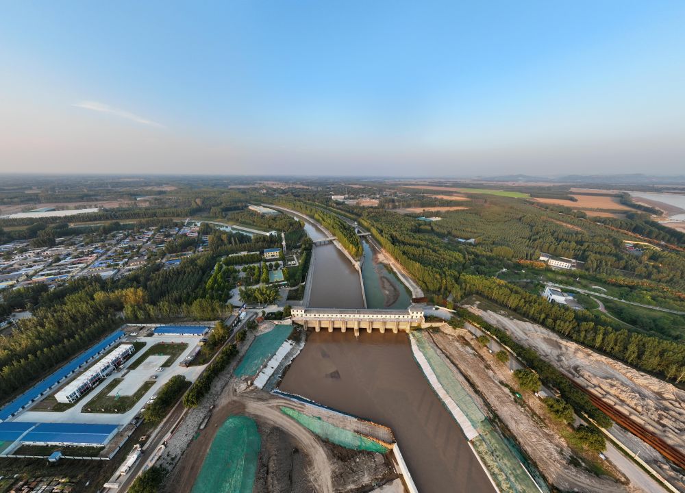 山東聊城位山灌區的黃河位山閘和引水渠(2023年10月10日攝,無(wú)人機照片)。新華社記者 邢廣利 攝