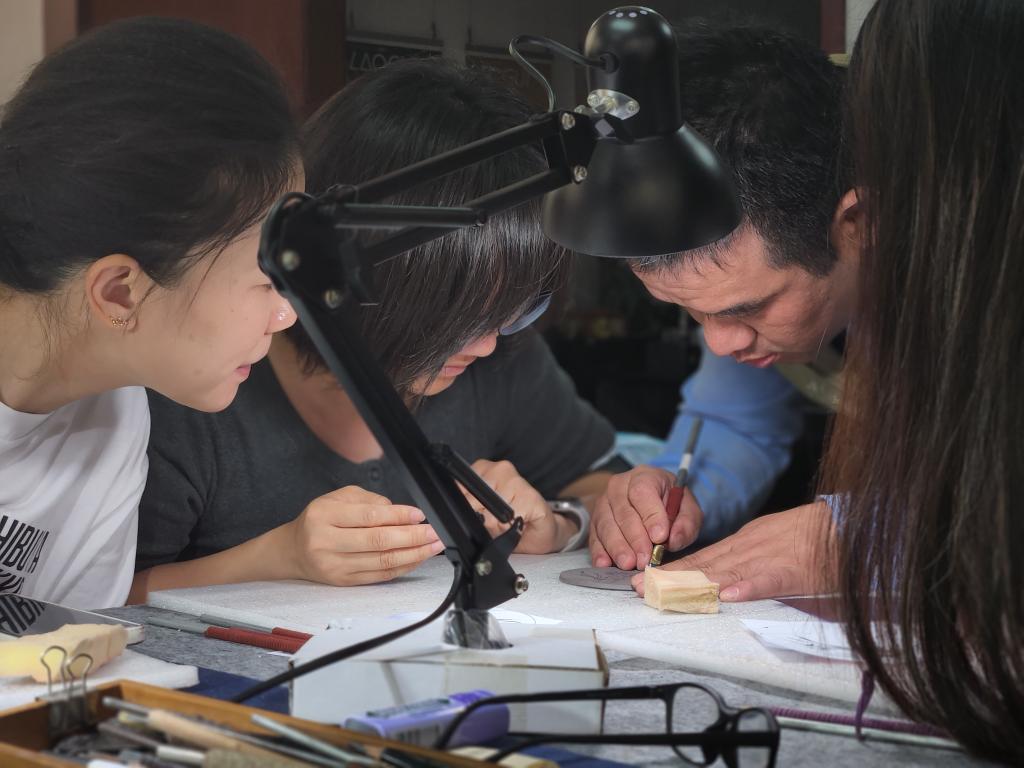 上海市民藝術(shù)夜校篆刻陶刻課堂上吳寶平(左三)正在指導雕刻手法。新華社記者 王默玲 攝