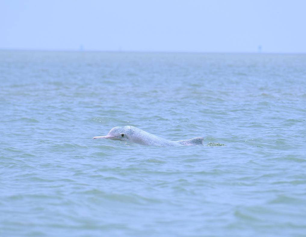 廣西欽州市三娘灣海域,一頭野生中華白海豚在自由嬉戲。新華社記者 周華 攝