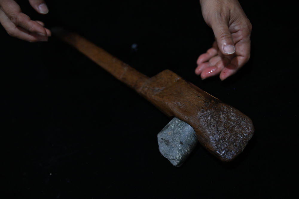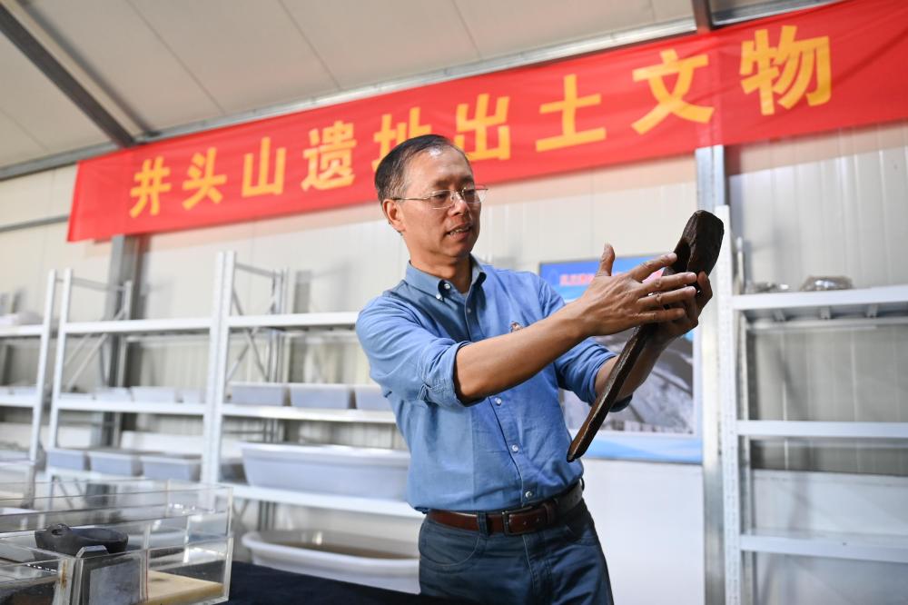 2023年11月3日,浙江省文物考古研究所史前室主任孫國平展示井頭山遺址出土的木柄石斧。新華社記者 黃宗治 攝