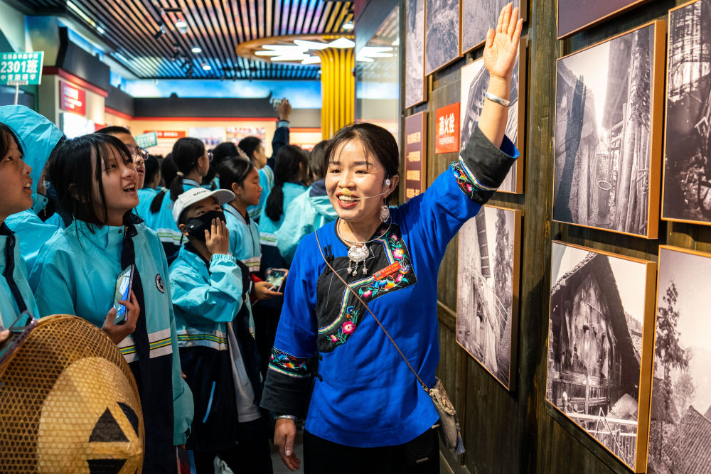 在湘西十八洞村,講解員施艷琴為游客們講解十八洞村的故事(2023年11月1日攝)。新華社記者陳思汗攝