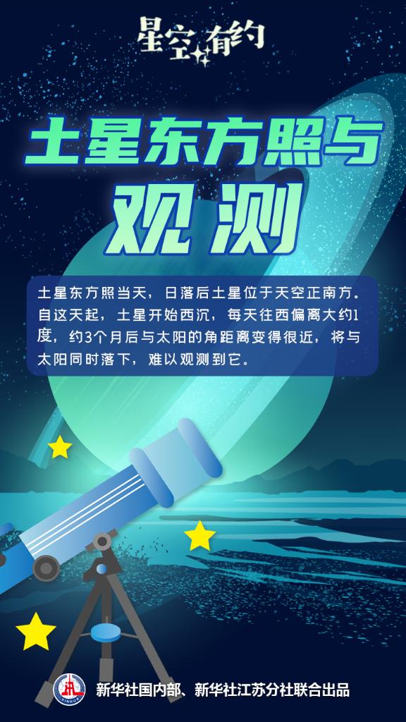 新華社南京11月21日電(記者王玨玢、邱冰清)11月23日17時(shí)47分迎來(lái)土星東方照,屆時(shí)土星將位于天空正南方。土星東方照后的一段時(shí)間,土星觀(guān)賞條件會(huì )逐漸變差,直至完全不可見(jiàn)。到下一次沖日前后,又迎來(lái)下一個(gè)土星觀(guān)賞的最佳時(shí)機。什么是土星東方照?它和土星沖日時(shí)看到的土星有什么區別?天文科普專(zhuān)家為您揭秘。