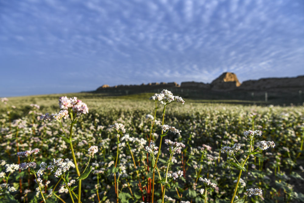 寧夏吳忠市鹽池縣一處長(cháng)城腳下蕎麥花開(kāi)放(2023年8月18日攝)。新華社記者 馮開(kāi)華 攝