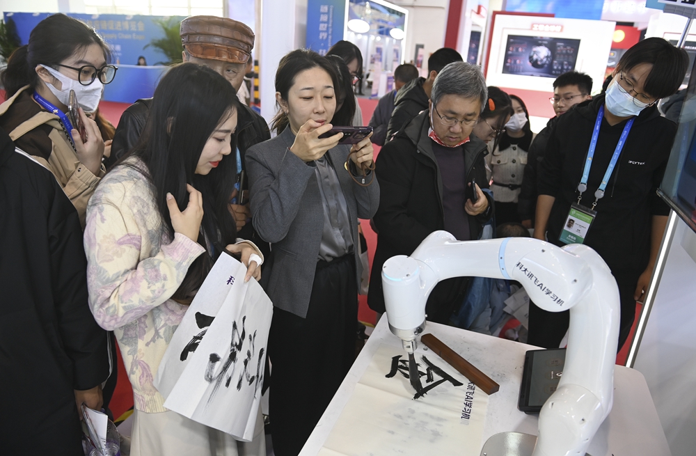 參觀(guān)者在首屆中國國際供應鏈促進(jìn)博覽會(huì )數字科技鏈展區科大訊飛展位觀(guān)看一款AI書(shū)法機器人寫(xiě)毛筆字(2023年12月2日攝)。新華社記者 蔡湘鑫 攝