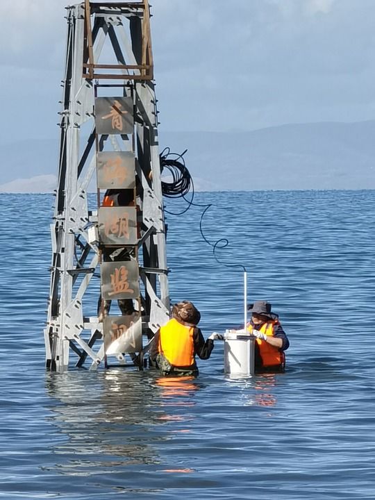 2023年9月6日,青海省水文水資源測報中心工作人員對設立在青海湖上的自記水位計進(jìn)行數據下載和設備運行維護工作。(受訪(fǎng)單位供圖)