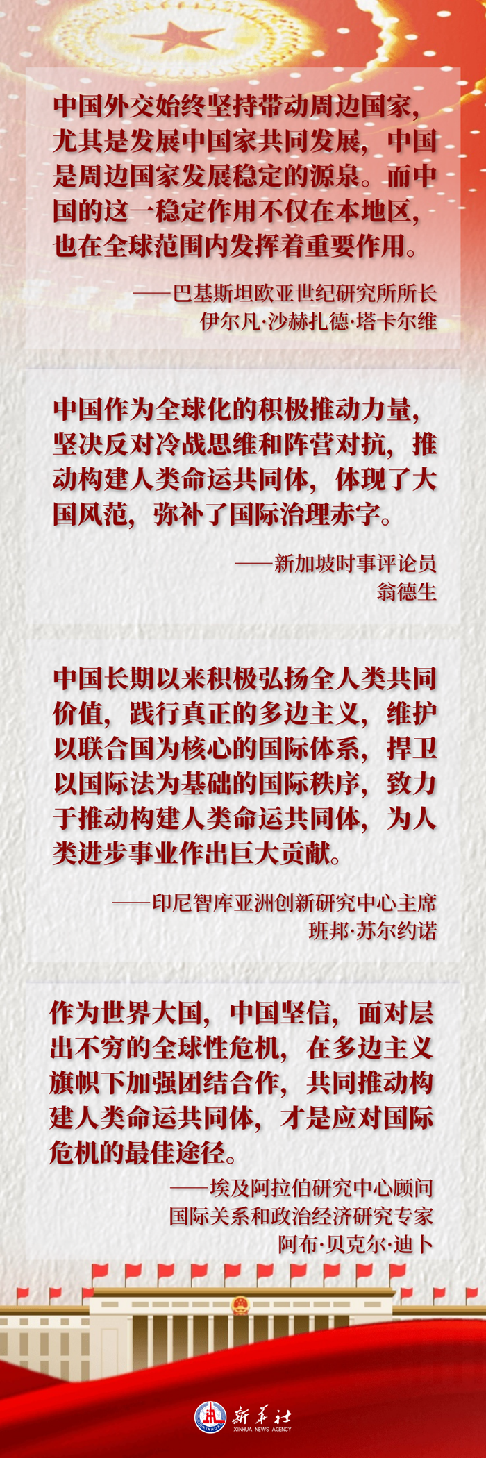 中國全國兩會(huì )持續吸引世界目光。作為世界第二大經(jīng)濟體和聯(lián)合國安理會(huì )常任理事國,新征程上的中國如何推進(jìn)大國外交、將產(chǎn)生哪些積極影響,是國際社會(huì )熱議的話(huà)題。兩會(huì )向世界傳遞明確而重要信息:中國將走和平發(fā)展道路,謀求互利共贏(yíng),推動(dòng)全球治理朝著(zhù)更加公正合理的方向發(fā)展。