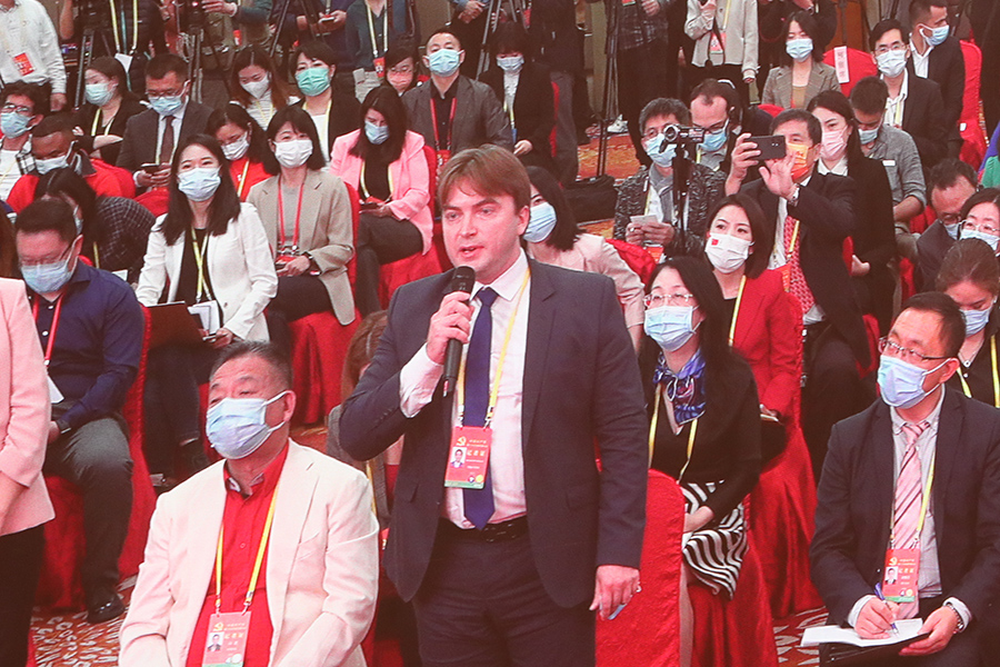 中國共產(chǎn)黨第二十次全國代表大會(huì )新聞發(fā)言人2022年10月15日(星期六)16時(shí)30分在人民大會(huì )堂舉行新聞發(fā)布會(huì )。圖為俄通塔斯社記者。(新華網(wǎng) 王翰林 攝)