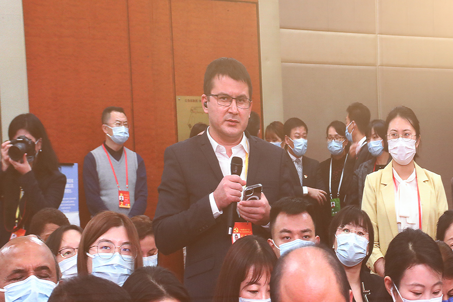中國共產(chǎn)黨第二十次全國代表大會(huì )新聞發(fā)言人2022年10月15日(星期六)16時(shí)30分在人民大會(huì )堂舉行新聞發(fā)布會(huì )。圖為烏茲別克斯坦人民言論報記者。(新華網(wǎng) 王翰林 攝)