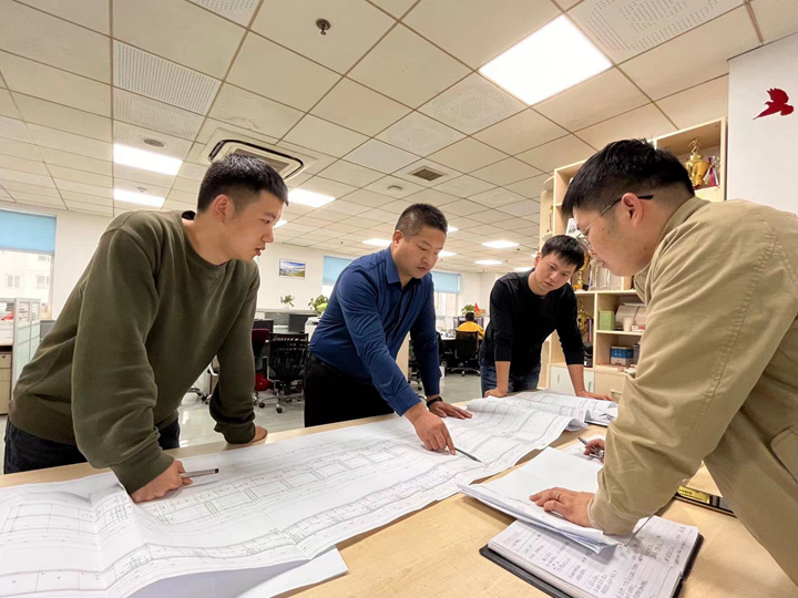 徐斌(左二)和同事在討論設計方案。2022年10月攝于中鐵第一勘察設計院。