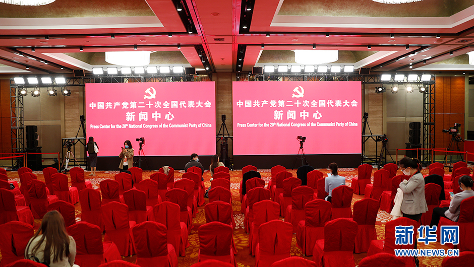 10月17日(星期一)15:00,二十大新聞中心將在梅地亞新聞中心二層新聞發(fā)布廳舉辦第二場(chǎng)記者招待會(huì )。圖為記者招待會(huì )前新世紀日航飯店三層世紀廳分會(huì )場(chǎng)。(新華網(wǎng) 陳杰 攝)