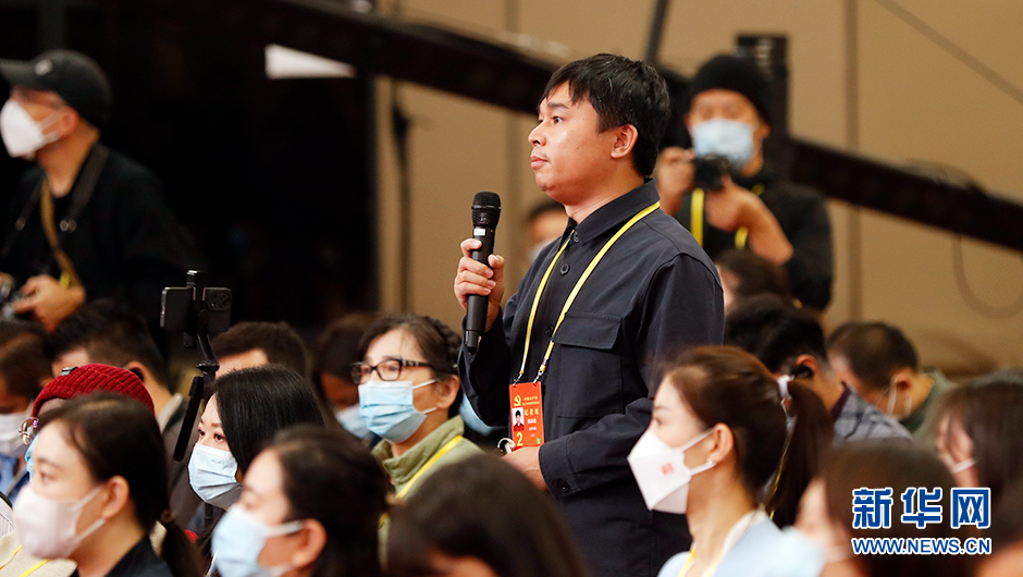10月21日(星期五)10:00,二十大新聞中心舉辦第五場(chǎng)記者招待會(huì )。圖為光明日報記者在分會(huì )場(chǎng)提問(wèn)。(新華網(wǎng) 陳杰 攝)