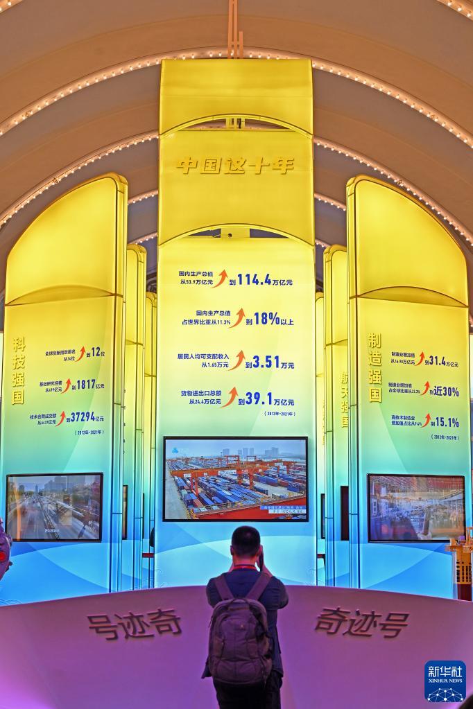 觀(guān)眾在“奮進(jìn)新時(shí)代”主題成就展中央綜合展區內拍攝中國經(jīng)濟“奇跡號”巨輪模型(2022年10月8日攝)。新華社記者 李鑫 攝