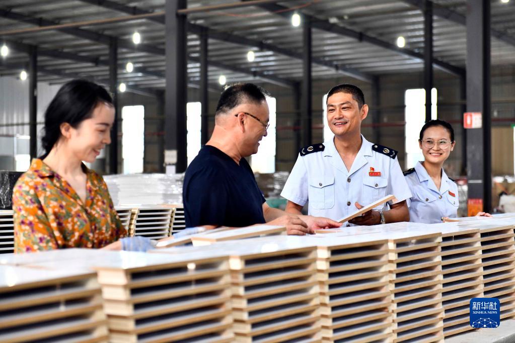 2021年6月16日,在菏澤金然木制品有限公司,山東省菏澤市曹縣稅務(wù)局的工作人員上門(mén)走訪(fǎng),介紹出口退稅相關(guān)優(yōu)惠政策。新華社記者 郭緒雷 攝