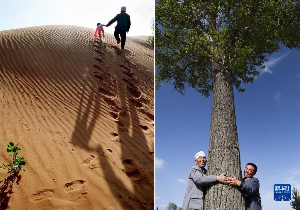 這是一張拼版照片,左圖為:1998年8月,榆林市靖邊縣郭成旺老人帶著(zhù)曾孫行進(jìn)在沙漠中。老人希望子子孫孫植樹(shù)造林,直到沙漠都變成綠洲;右圖為:2020年5月22日,99歲的郭成旺老人(左)與孫兒郭建軍抱著(zhù)當年栽下的第一棵楊樹(shù),向參觀(guān)者介紹當年植樹(shù)的情景。1984年,郭成旺承包了離家10公里處的荒沙地,帶領(lǐng)全家常年吃住在沙地的簡(jiǎn)易房里,為4.5萬(wàn)畝沙漠披上了綠裝。新華社記者 陶明 攝