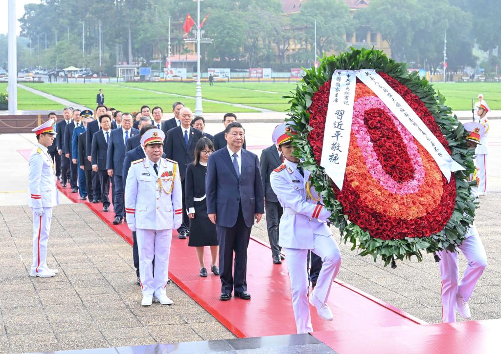 13日上午,習近平總書(shū)記在河內瞻仰胡志明陵并敬獻花圈。