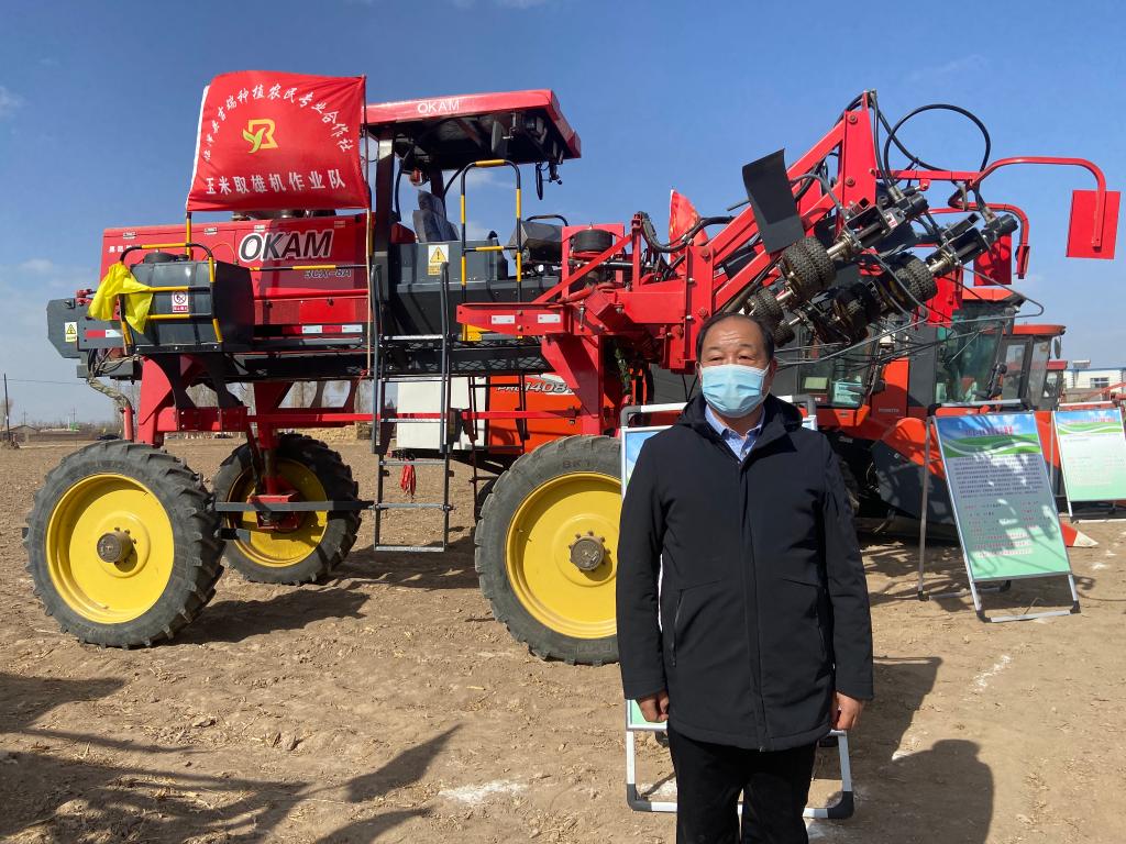 呂國斌和他購買(mǎi)的制種玉米去雄機合影。新華社記者 王朋 攝