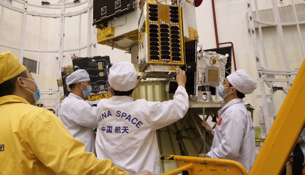 發(fā)射前,工作人員將APSCO-SSS-1小衛星與火箭對接。(北航供圖)