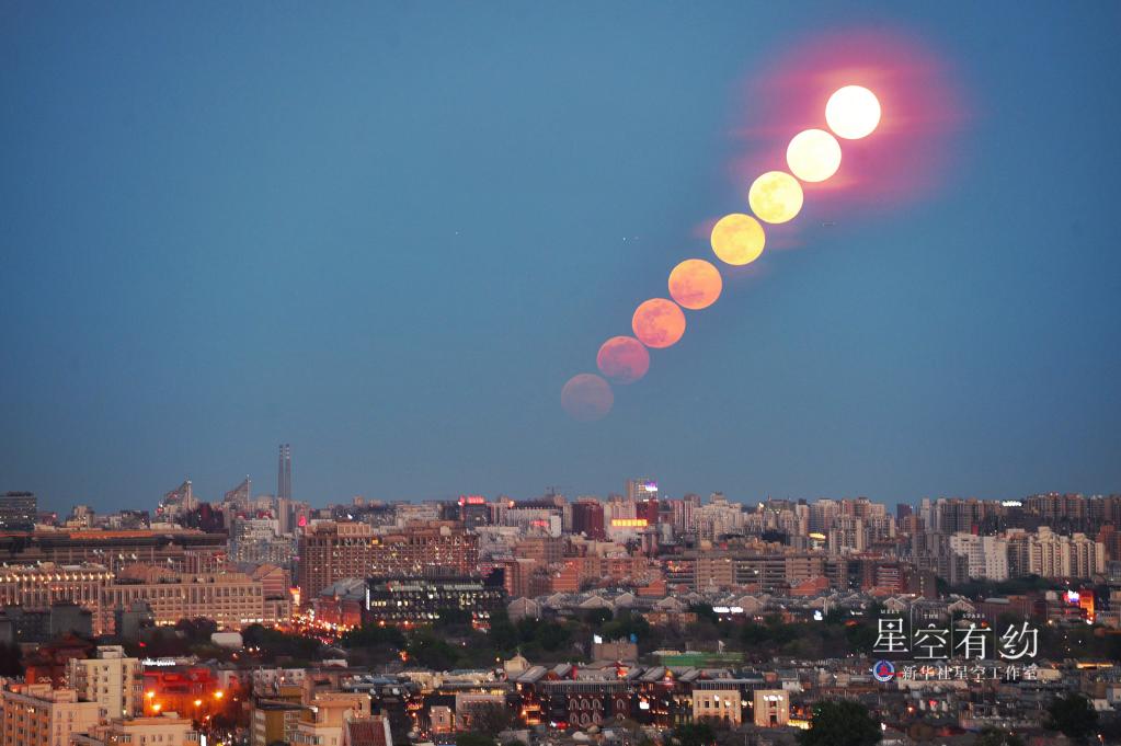 這是北京市天文愛(ài)好者王俊峰2017年4月11日在北京拍攝的滿(mǎn)月升起(多張疊加)。(本人供圖)