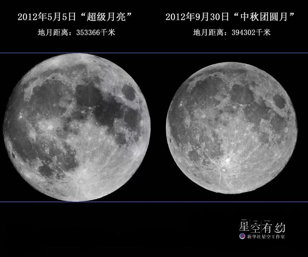 這是南京天文愛(ài)好者協(xié)會(huì )李雷2012年在鄭州拍攝的“超級月亮”和“中秋團圓月(滿(mǎn)月)”(拼版)。(本人供圖)